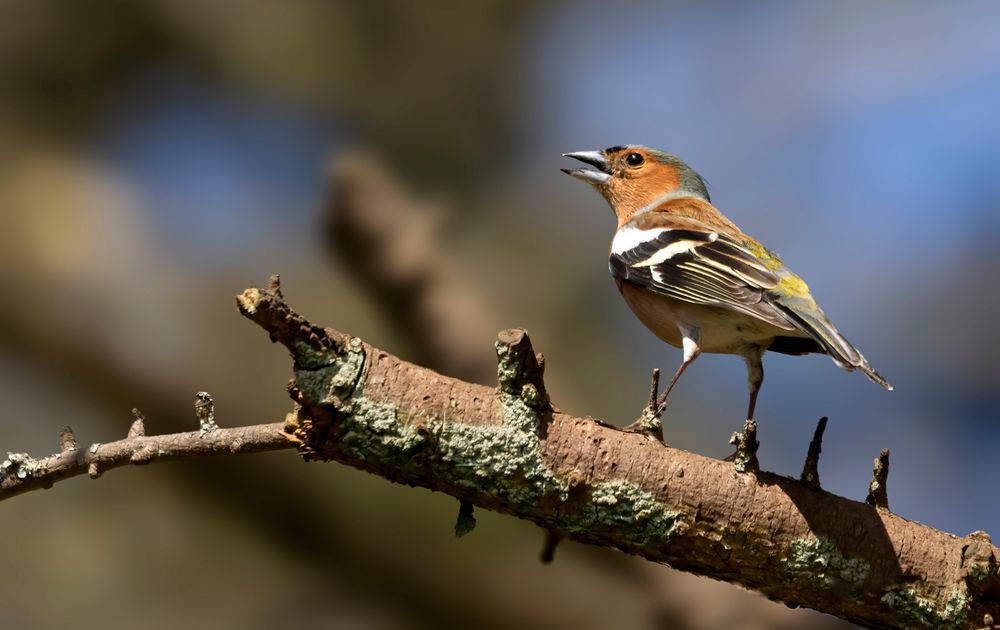 Mooie slanke mannenvink, druk met zijn omgeving bezig