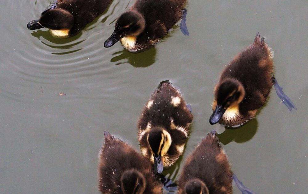 Jonge eendjes zwemmen onder de brug doorwaar ik op sta.
