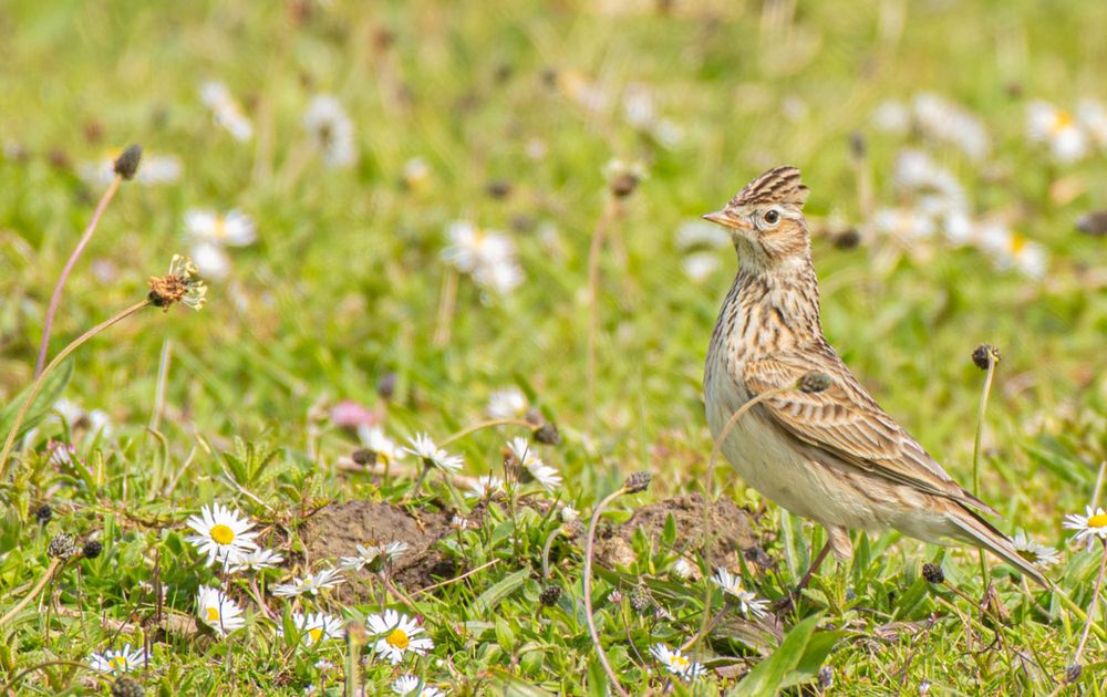 Prachtige veldleeuwerik meg mooie opgezette kuif in een lentewei vol madeliefjes. Ik vond het een prachtig moment want zo vaak zie je ze niet meer in de weidevogelgebieden, terwijl dat toch van oudsher hun biotoopwas.