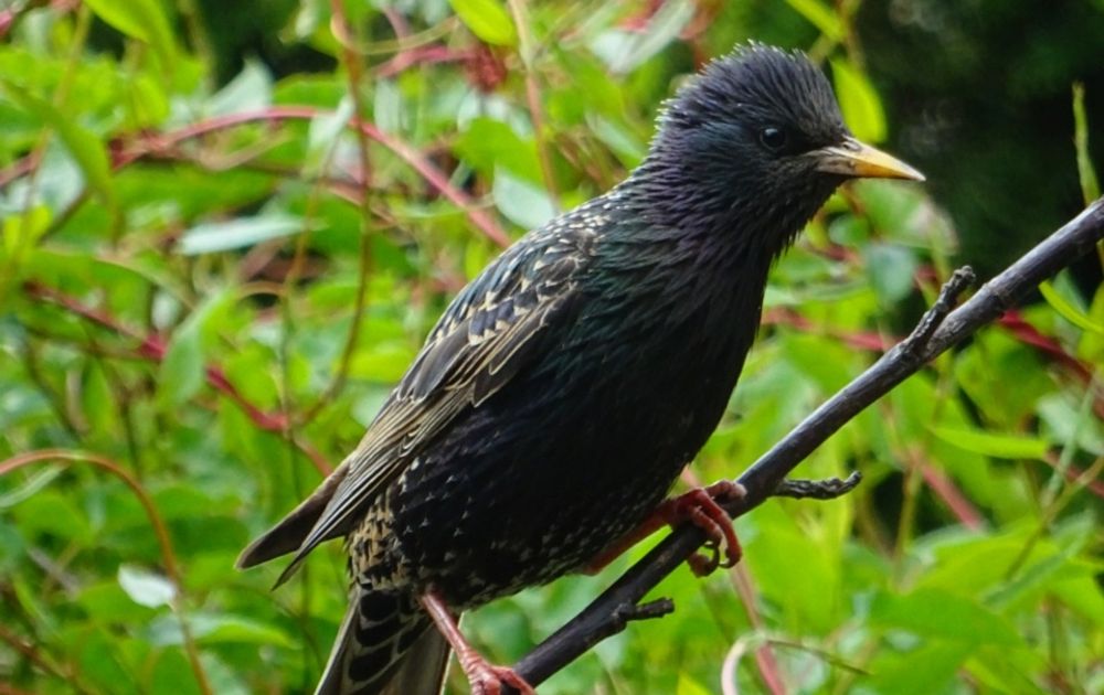 Dankzij de potten vogelpindakaas van de Vogelbescherming besloten vier koppels spreeuwen in onze postzegel tuin hun kraam snack loket op te zetten. Gevolg: 16 kuikens en een oorverdovend kabaal. Maar wat een genieten van alle levendigheid. Hier een van de ouders rustend op een takje.