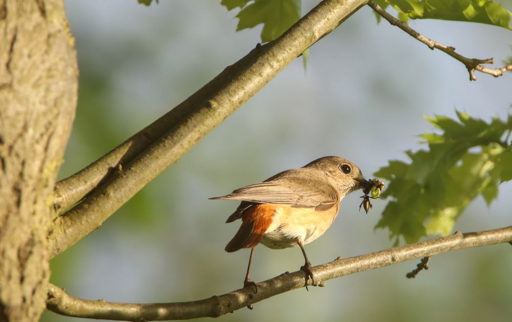 Gekraagde roodstaart (v) aan het insecten verzamelen voor de jongen.