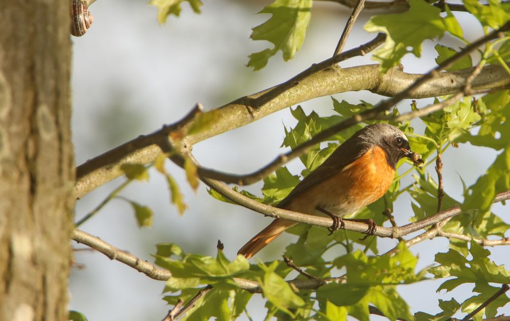 Dit keer de gekraagde roodstaart (m) die voedsel aan het verzamelen is voor de jongen en wie goed kijkt ziet linksboven ook nog een huisjesslak in beeld.