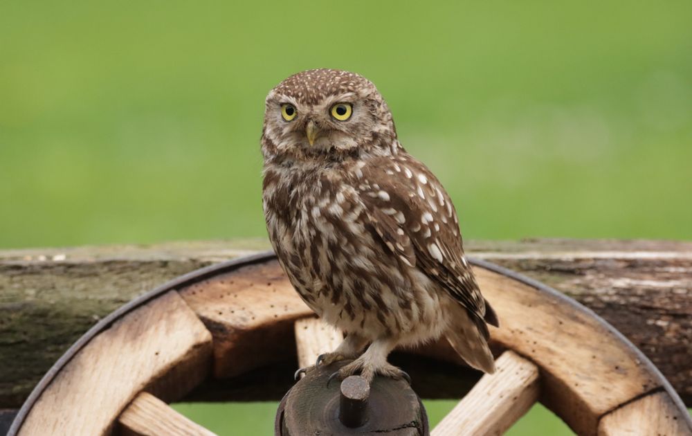 Steenuil in juni op zoek naar eten voor de jongen. De steenuil komt nu regelmatig in onze tuin op zoek naar wormen in het gras of naar eten. Op dit moment zijn de muizen moeilijk te vangen en deze heeft erge honger. Eerst eet hij zelf heel wat en dan neemt hij het mee naar een nestkast in de buurt, of voor het vrouwtje of voor de jongen. Gemaakt in juni 2021