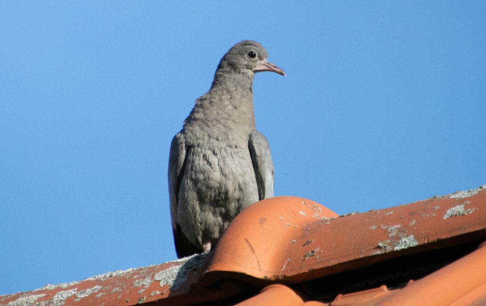 Holenduif zat boven op het dak van de schuur, nog nooit gezien of van gehoord