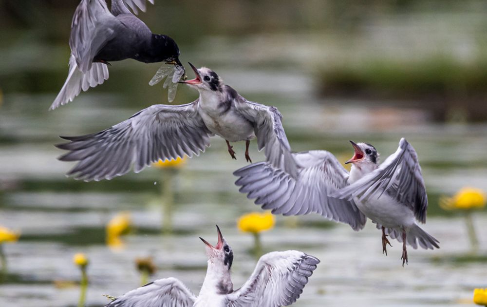 De jonge zwarte sternen zijn hier al vrij groot. Ze vliegen nog niet echt maar als de ouders met iets lekkers komen gaan ze al wel een stukje de lucht in en wie dat het beste kan wordt beloond.