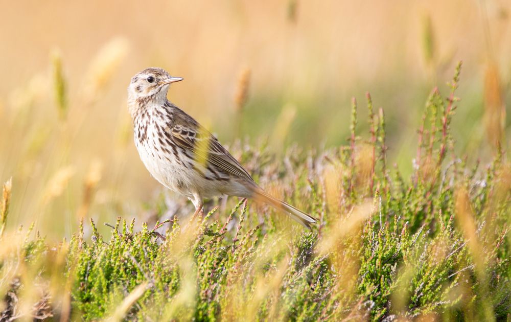 Een pieper tussen de planten en in het gras. Vast een graspieper.