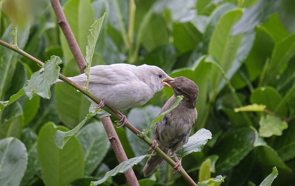 jonge (leucistische) huismus krijgt eten