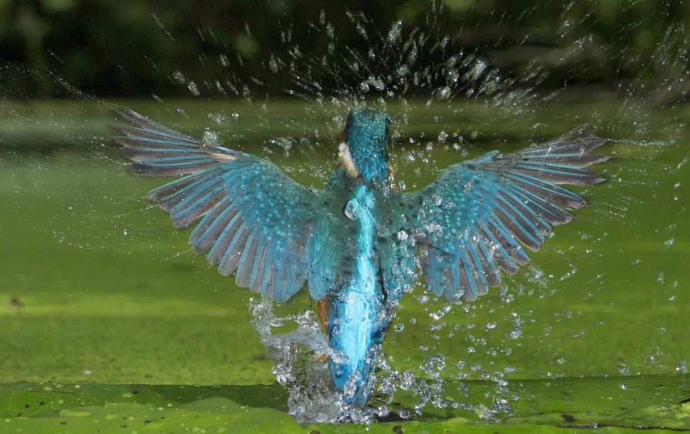 In de fotohut van Jeroen Stel deze IJsvogel foto kunnen maken waar hij net bovenwaterkomt met veel spetters!