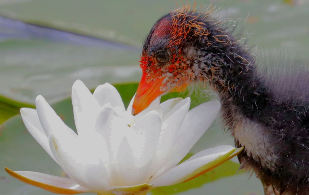 In navolging van de adulte meerkoet checkt het kuiken de waterlelie op iets eetbaars. De waterlelie weerspiegelt in zijn ogen.