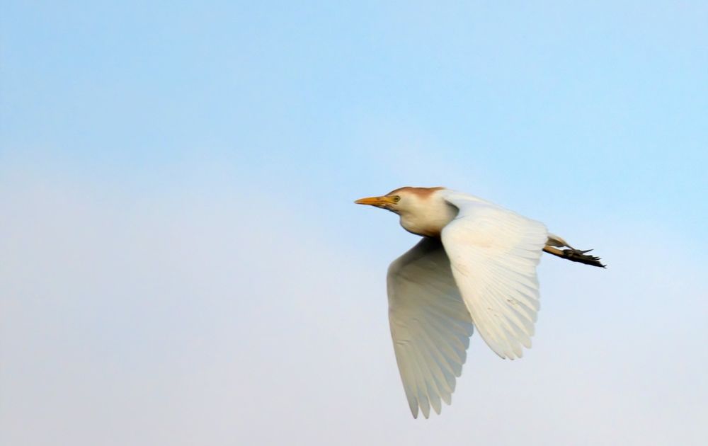 Koereiger vliegt langs in ochtendlicht