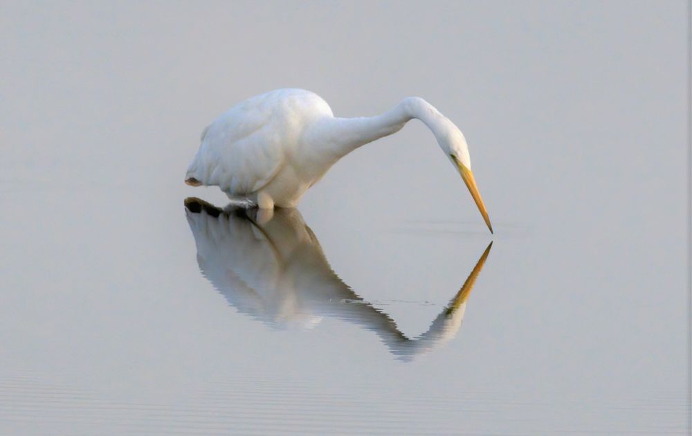 Deze Grote Zilverreiger jaagt boven een spiegelglad wateroppervlak. Hierdoor ontstaat een mooie symmetrie in de foto.