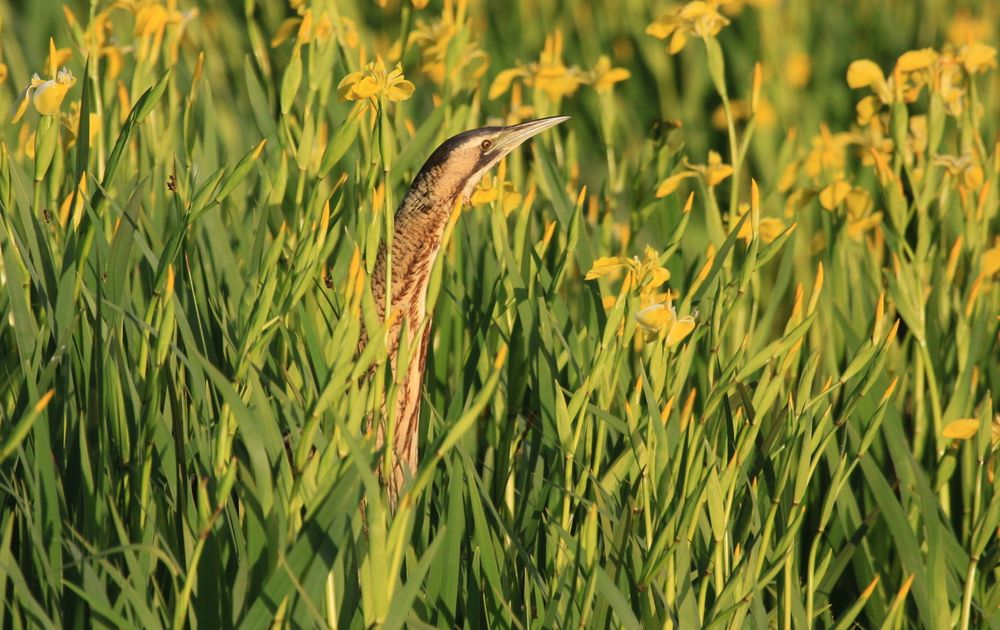 Het was een volkomen verrassing om de Roerdomp tussen de Lissen te zien staan. Toch wel opvallend maar hij voelde zich niet bespied.