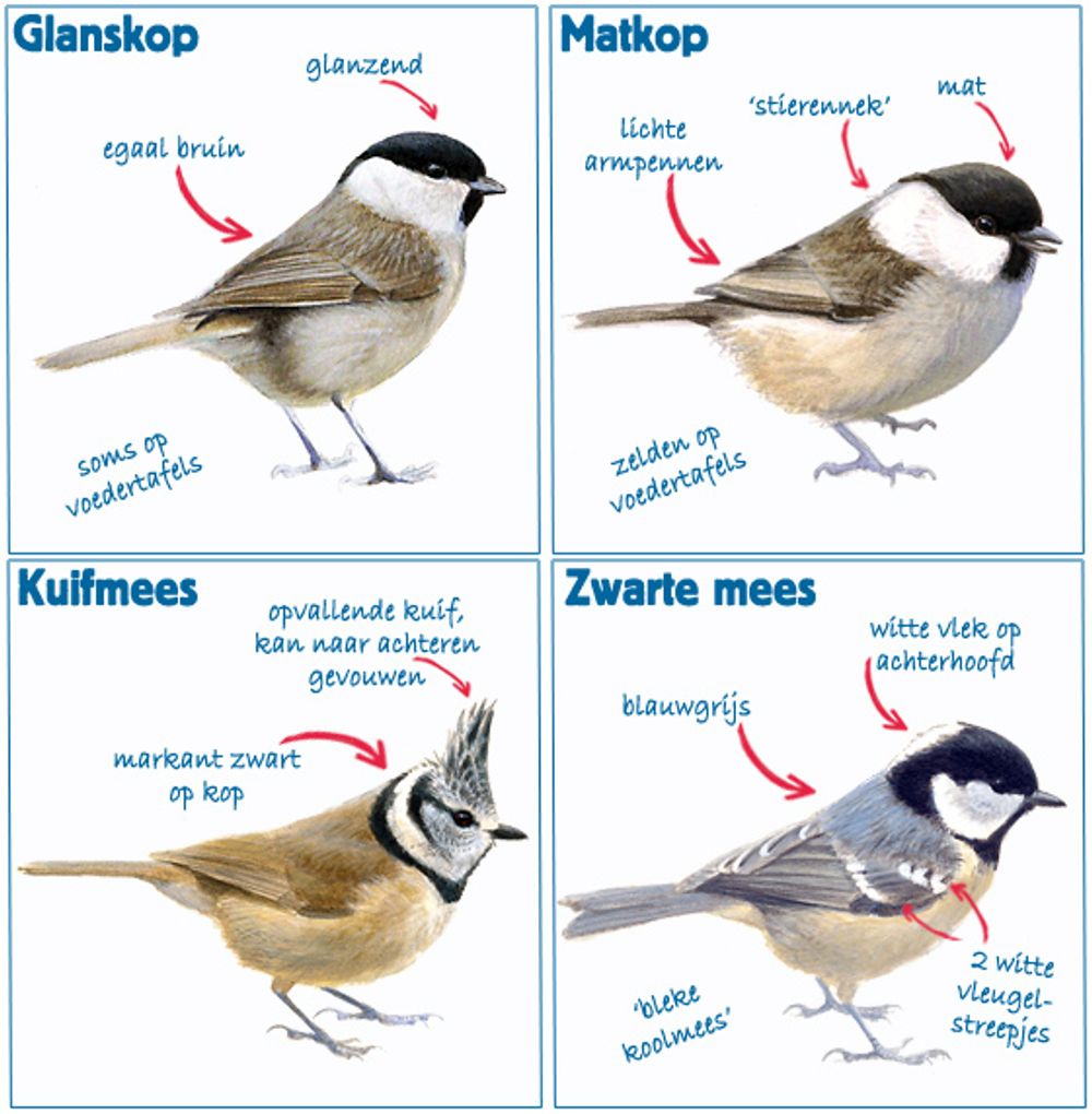 Zwarte mezen komen in sommige winters massaal naar ons land vanuit Scandinavië. Kuifmezen, glanskoppen en matkoppen zijn standvastiger: ze zijn er het hele jaar en houden ongeveer hetzelfde territorium. Deze vier 'bosmezen' maken 's winters vrolijke geluidjes, luister maar: