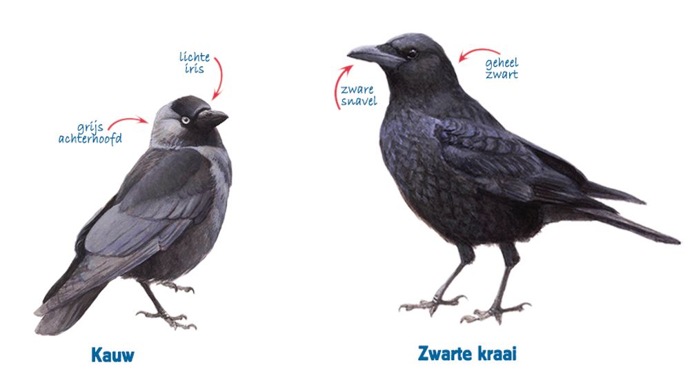 Leuk weetje: hoe ouder de kauw, hoe lichter de ogen! De oogkleur gaat van lichtblauw naar bijna wit. De zijkanten van het kopje zijn grijs. Aan die lichte ogen en dat grijze kopje ziet dat het een kauw is. Alles aan de zwarte kraai is namelijk gewoon pikzwart, ook de ogen en de kop, de naam zegt het eigenlijk al.